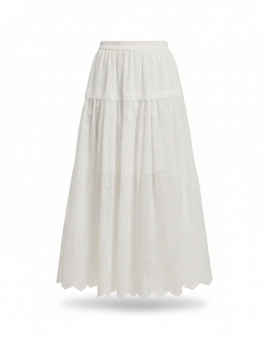 Découvrez notre jupe longue blanche ornée de délicates broderies florales, idéale pour un look frais et élégant.