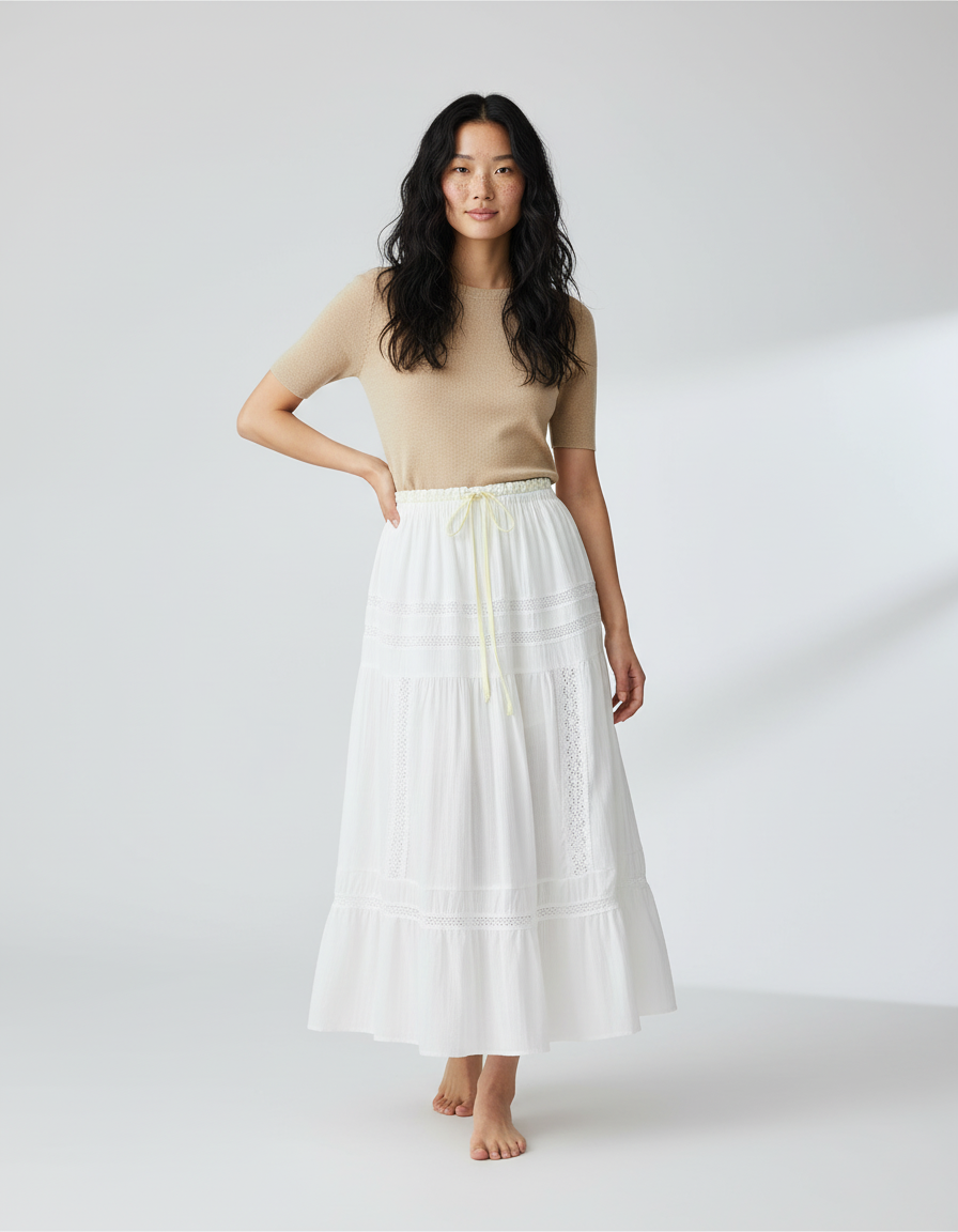 Confectionnée dans un coton aérien de première qualité, cette jupe promet une sensation de légèreté incomparable. Ses volants délicatement superposés et ses empiècements de dentelle ajourée ne sont pas seulement esthétiques ; ils garantissent une liberté de mouvement absolue, accompagnant chacun de vos pas avec une grâce naturelle. Son tombé impeccable, fluide et non contraignant, sublime toutes les silhouettes, vous offrant un confort premium et une allure bohème-chic irréprochable du matin jusqu'au soir.