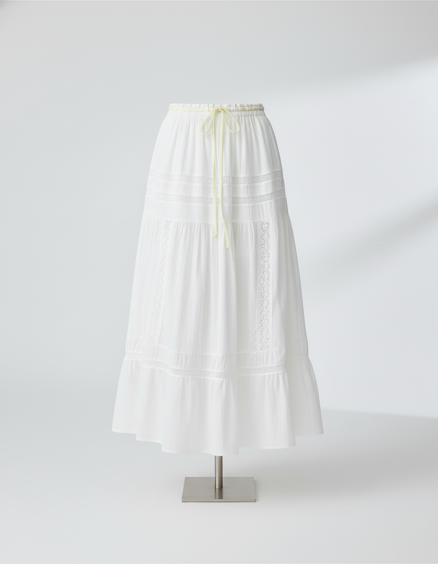 Cette jupe longue de couleur blanche présente une coupe trapèze avec des empiècements de dentelle. La taille est élastique et agrémentée d'un ruban.