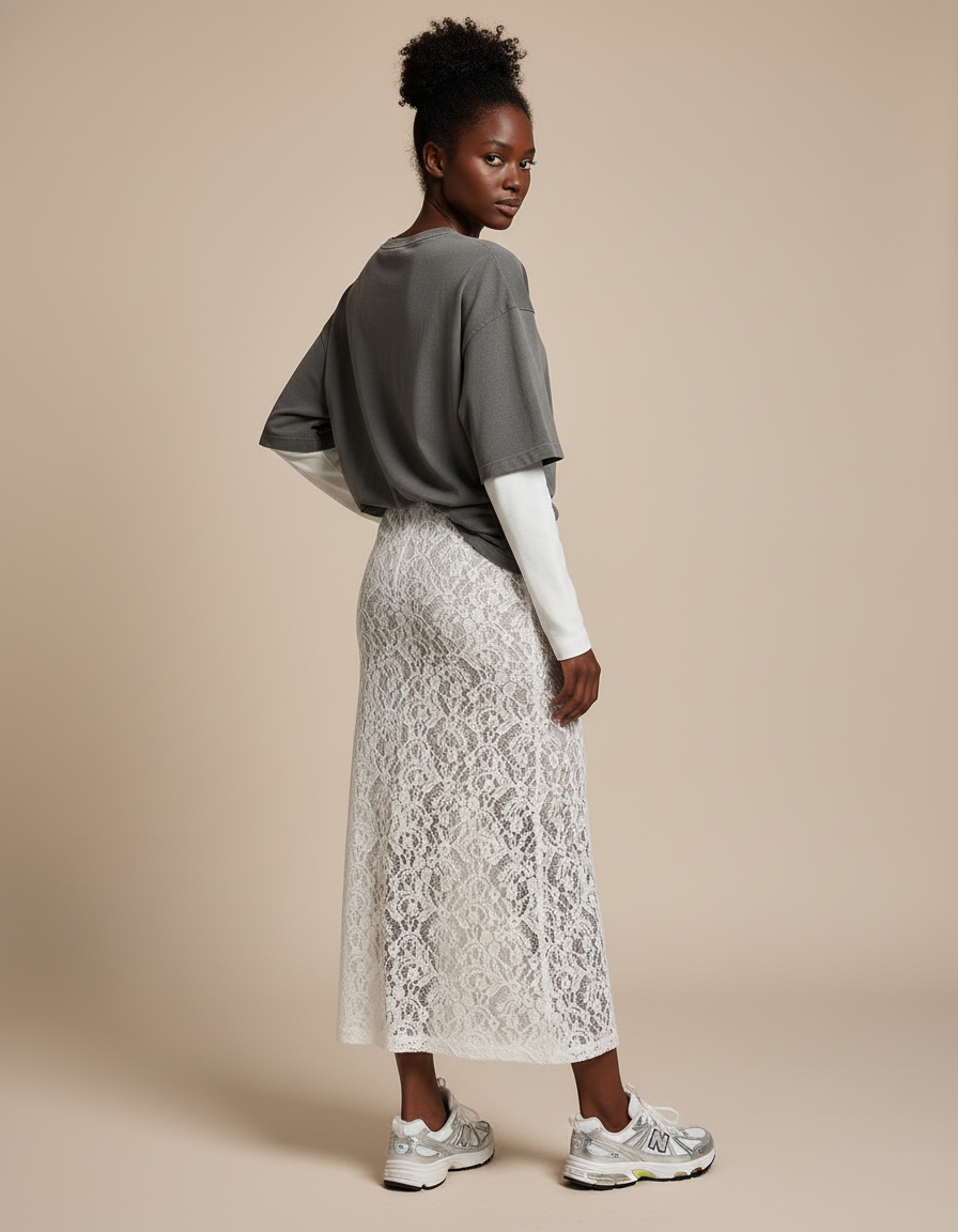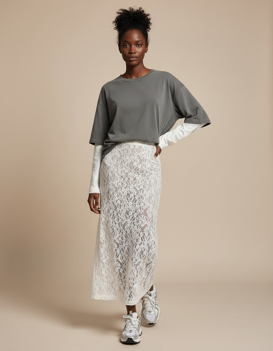Osez l'alliance des contrastes : associez-la à un t-shirt oversize en coton et des sneakers pour un look urbain audacieux, comme sur l'image, ou à un chemisier en soie et des sandales fines pour une élégance estivale raffinée. Pour les soirées, un top structuré et des talons transformeront instantanément cette jupe romantique en une tenue sophistiquée. La 'Jupe Blanche Dentelle Longue Perspective' s'adapte à chaque occasion, affirmant votre personnalité avec assurance et délicatesse.