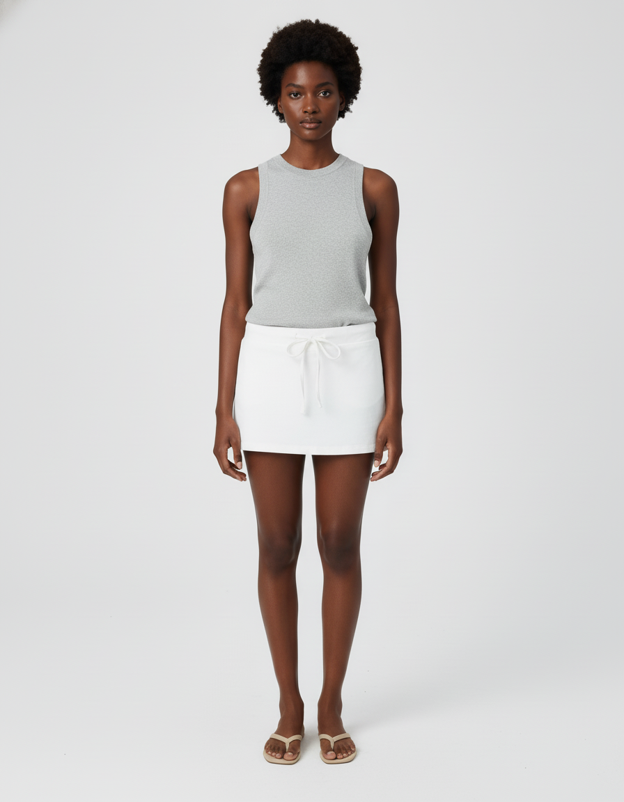 Cette jupe courte blanche présente une coupe droite et un cordon de serrage visible à la taille.
