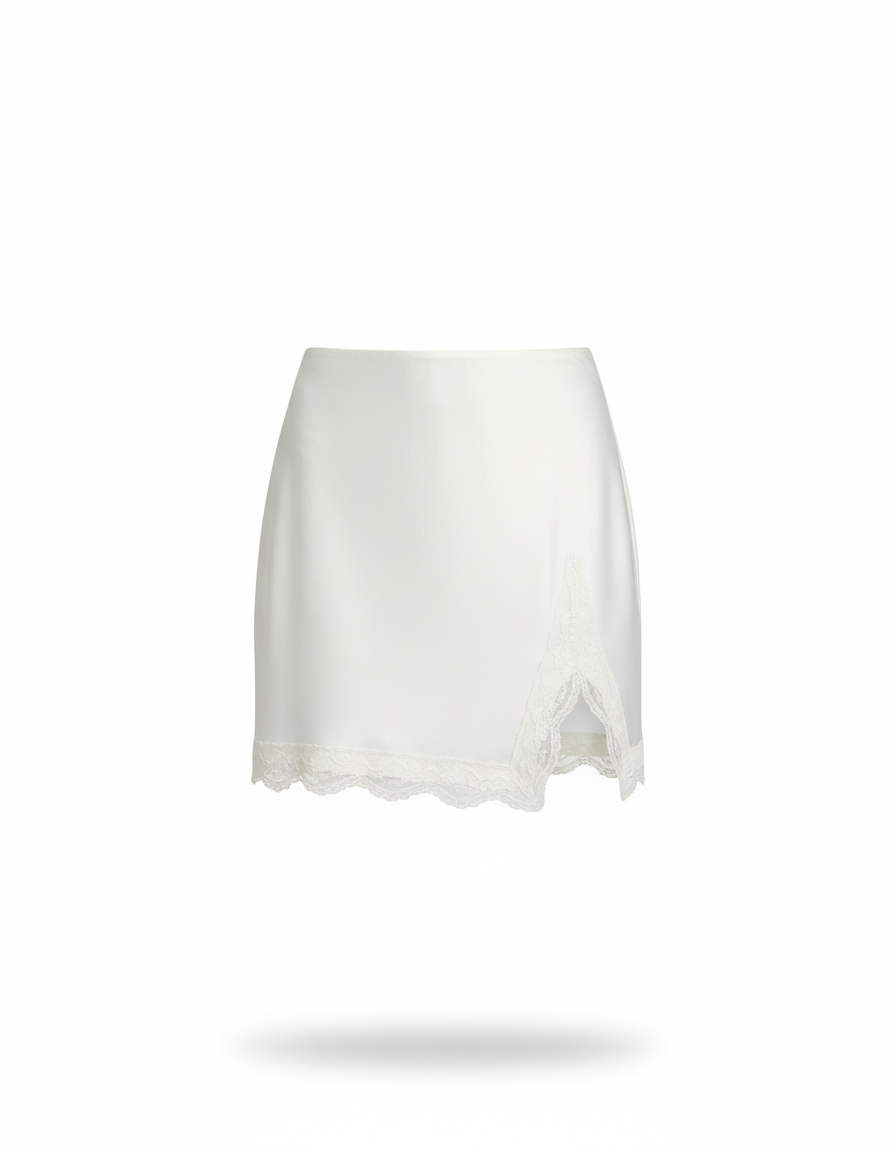 Cette jupe blanche en satin est un modèle court. Elle présente une fente latérale et des détails en dentelle sur l'ourlet.
