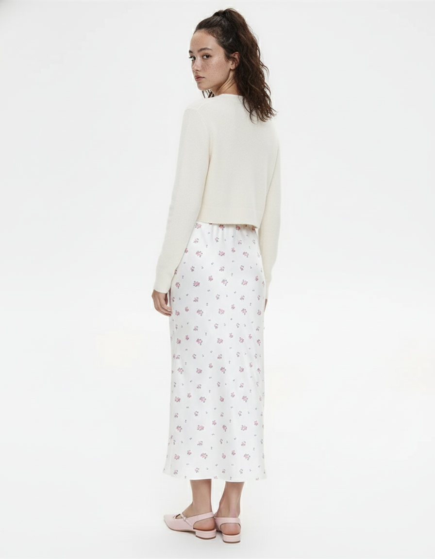 Imaginez-la pour un rendez-vous : associée à un cardigan court crème et des escarpins blush, comme sur notre image, elle dégage une sophistication douce et irrésistible. Pour une journée estivale chic, mariez-la à un top en soie uni et des sandales plates pour un look décontracté mais raffiné. En soirée, transformez-la avec un haut ajusté et des talons vertigineux pour une allure glamour et affirmée. Cette jupe n'est pas seulement un vêtement, c'est une invitation à exprimer votre style avec une élégance intemporelle et une touche de romantisme discret.