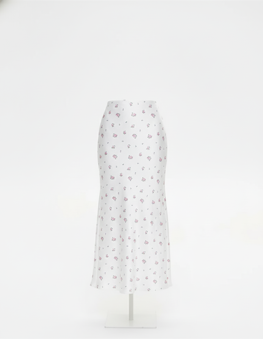 Cette jupe blanche présente un motif floral discret. Sa coupe est fluide et sa longueur atteint la cheville.