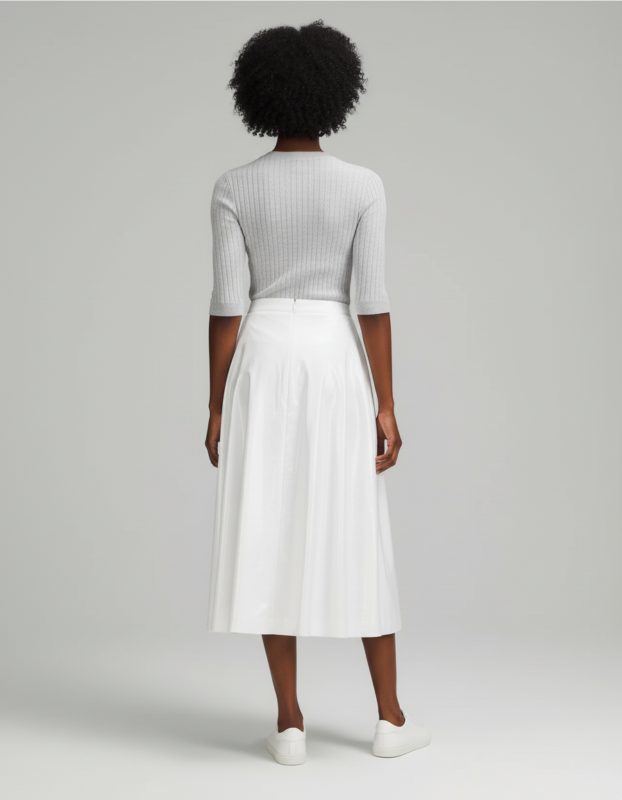 La Jupe Blanche Fluide Brillante Élégante est la pièce maîtresse d'une garde-robe moderne. Pour un look décontracté chic inspiré de l'image, associez-la à un pull fin côtelé gris et des sneakers blanches immaculées. En un instant, transformez-la pour une sortie sophistiquée : une blouse en soie fluide, des talons aiguilles et des bijoux minimalistes créeront une silhouette raffinée. Elle se prête aussi merveilleusement à un style plus audacieux avec un crop top ajusté ou une veste en jean pour les soirées estivales, prouvant sa polyvalence inégalée.