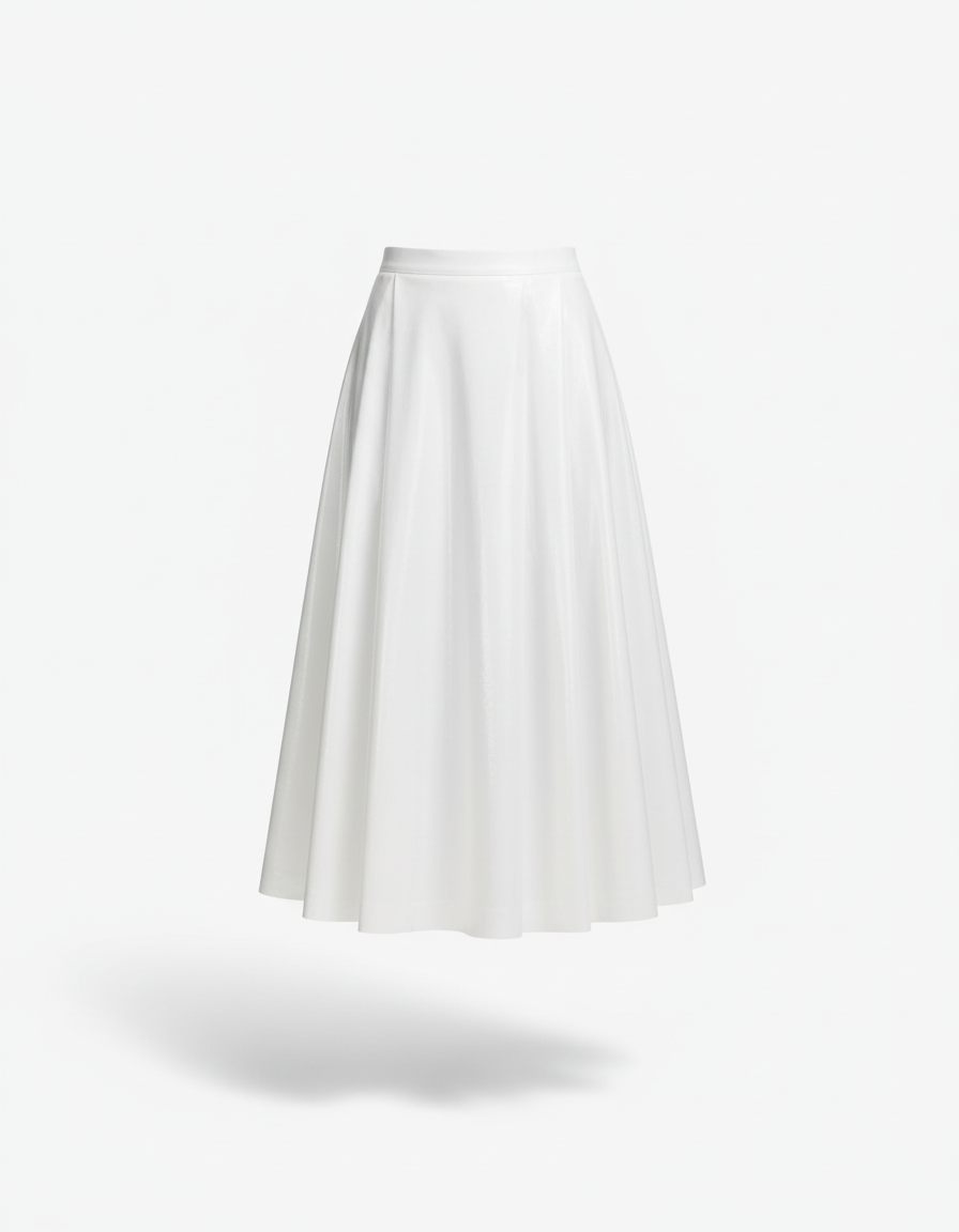 Cette jupe blanche présente une coupe évasée et une longueur midi, s'arrêtant à mi-mollet. Elle est confectionnée dans un tissu à l'aspect brillant.