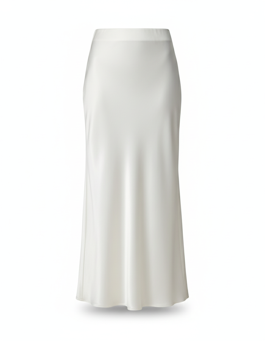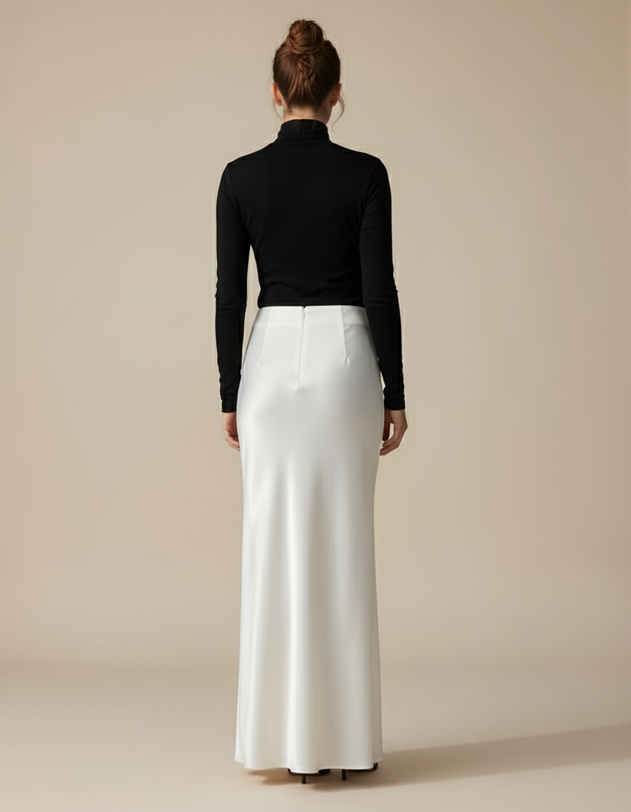 Cette jupe longue en satin blanc incarne l'élégance moderne et la fluidité.