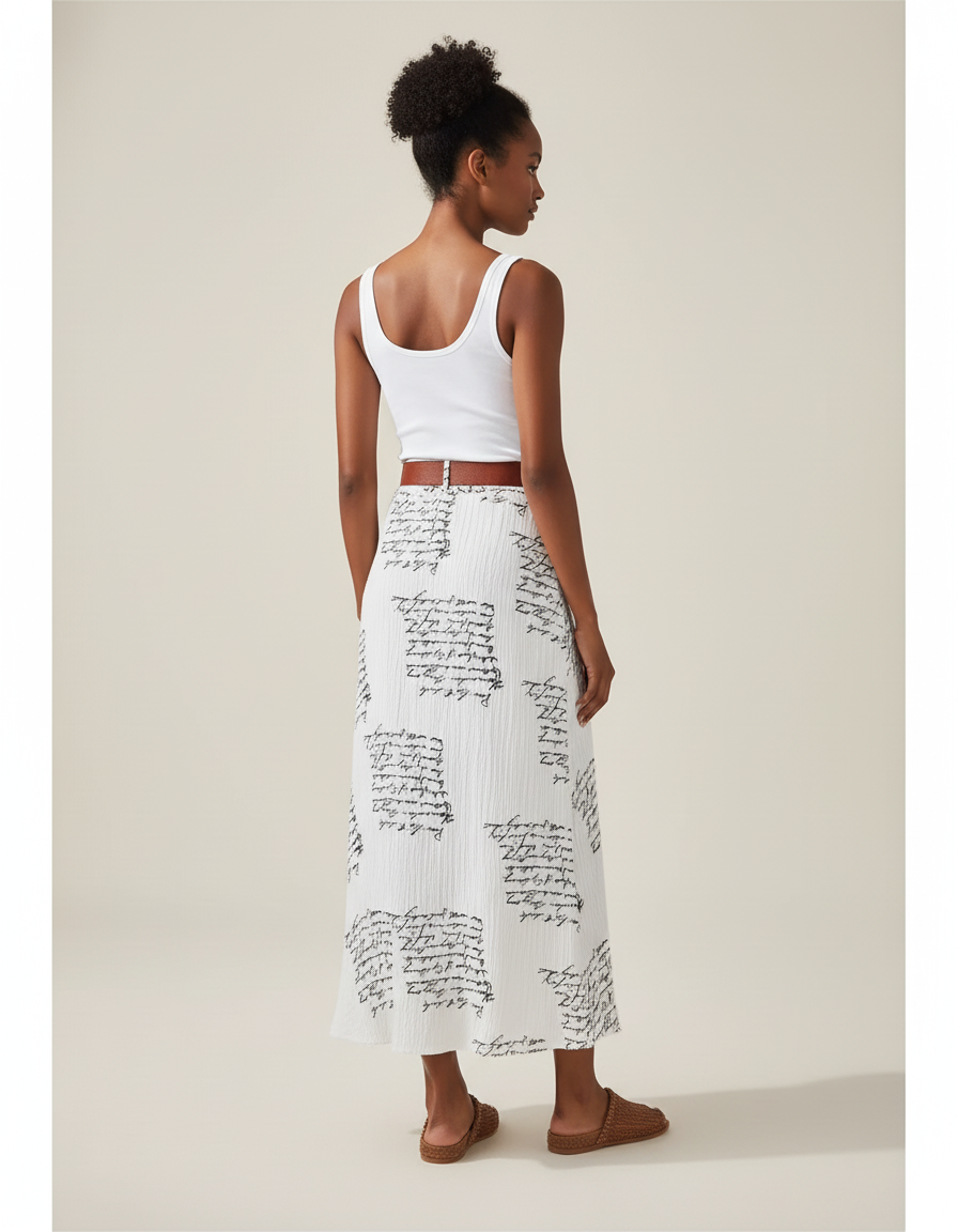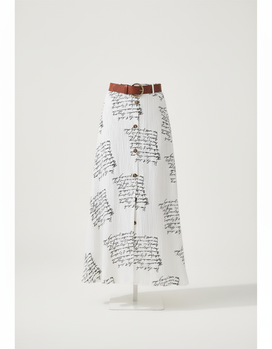 Découvrez la 'Jupe Blanche Imprimée Boutonnée Fluide Bohème', une pièce maîtresse conçue pour la femme moderne qui valorise l'élégance sans effort et le confort absolu. Confectionnée dans une viscose douce et aérienne, cette jupe ample caresse la silhouette avec une fluidité exquise, offrant une liberté de mouvement incomparable. Son imprimé manuscrit délicat, tel une œuvre d'art, raconte une histoire unique à chaque pas, vous distinguant avec subtilité et raffinement.