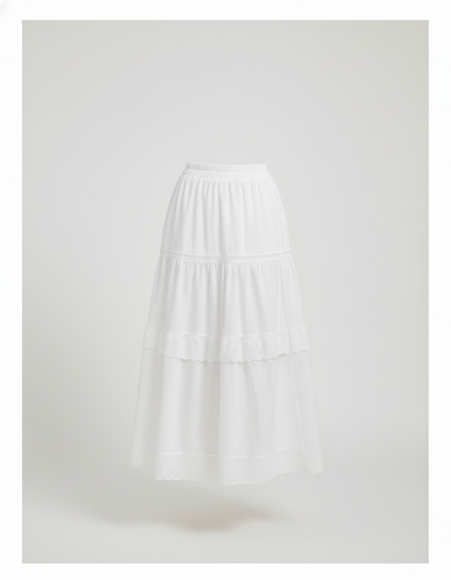 Cette jupe est un vêtement long de couleur blanche. Elle est composée de plusieurs niveaux superposés et intègre des détails en dentelle ajourée.