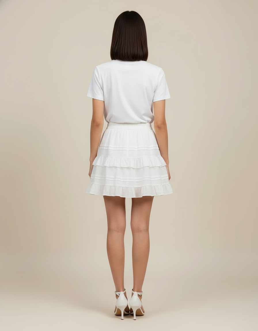 Adoptez un style frais et féminin avec notre Jupe Blanche Mini À Volants Chic.