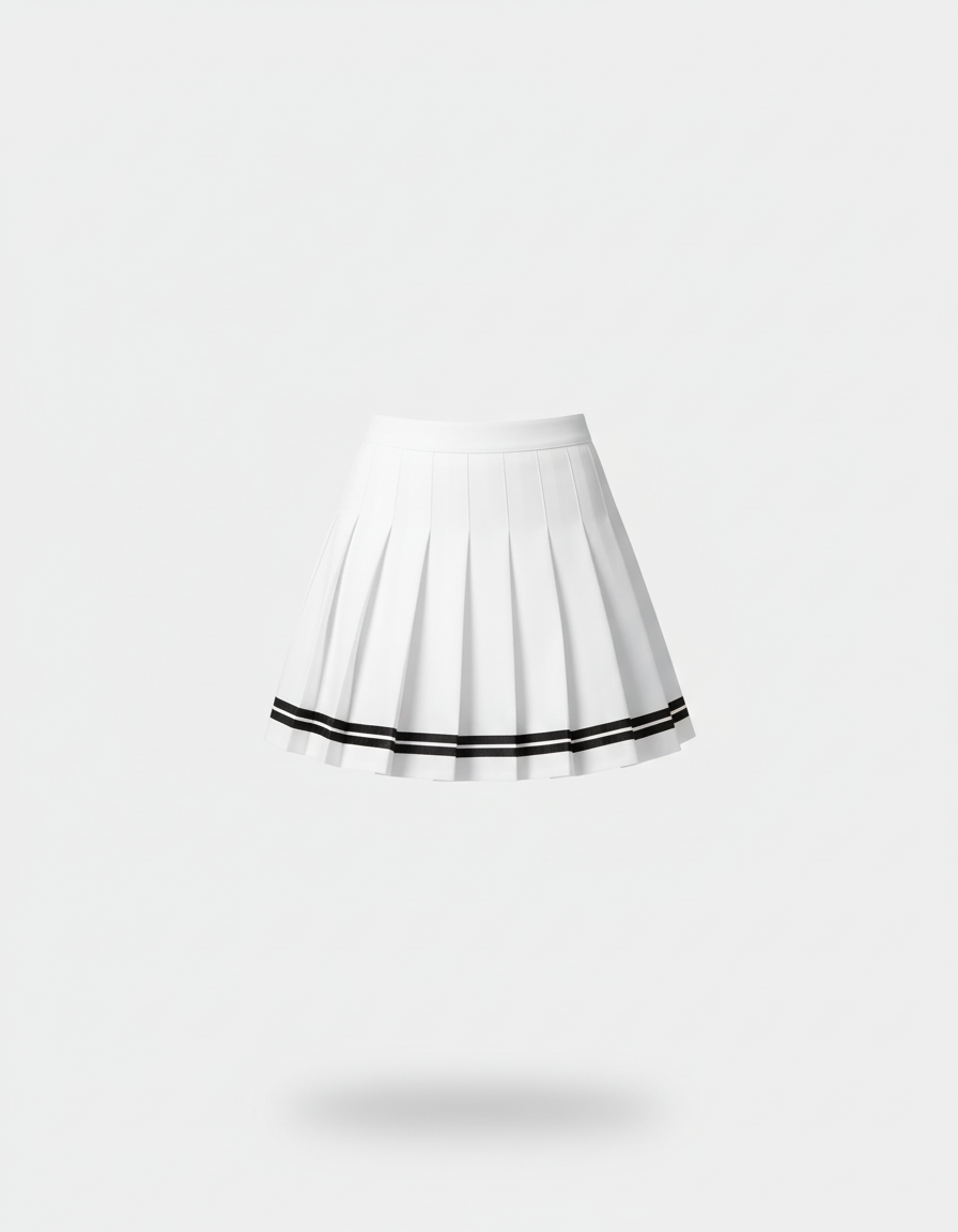 Cette jupe courte est de couleur blanche et présente un design plissé. Elle est dotée de deux bandes horizontales noires situées près de l'ourlet.