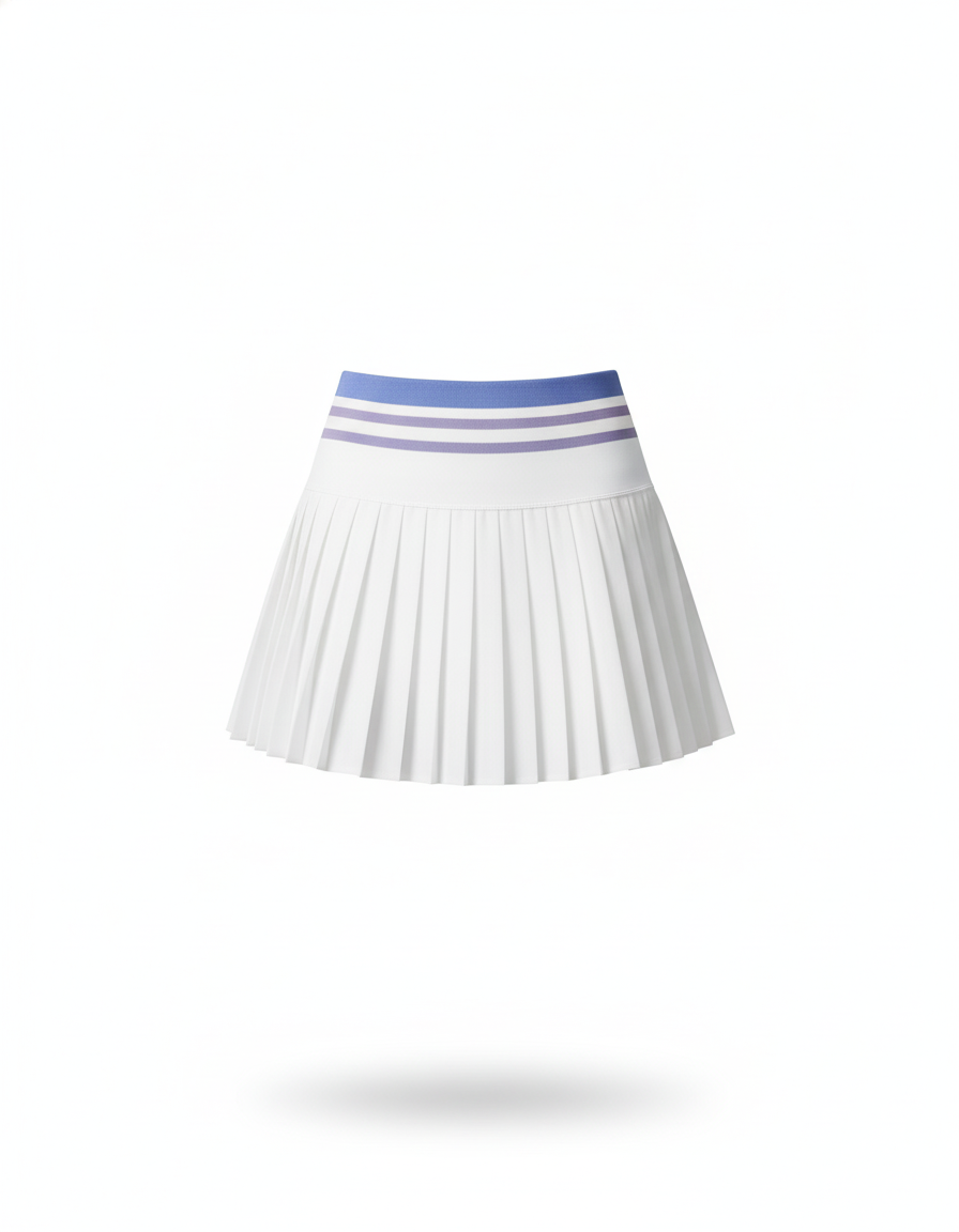 Cette jupe est une pièce plissée de couleur blanche. Elle présente une taille haute avec une bande de couleur sur la ceinture.