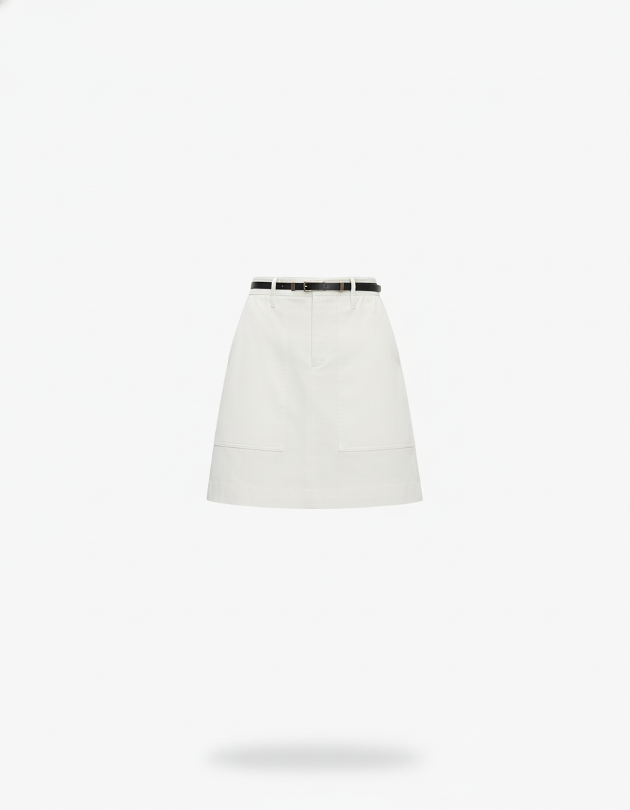 Cette jupe courte blanche présente une coupe trapèze et est équipée de deux poches plaquées sur le devant.