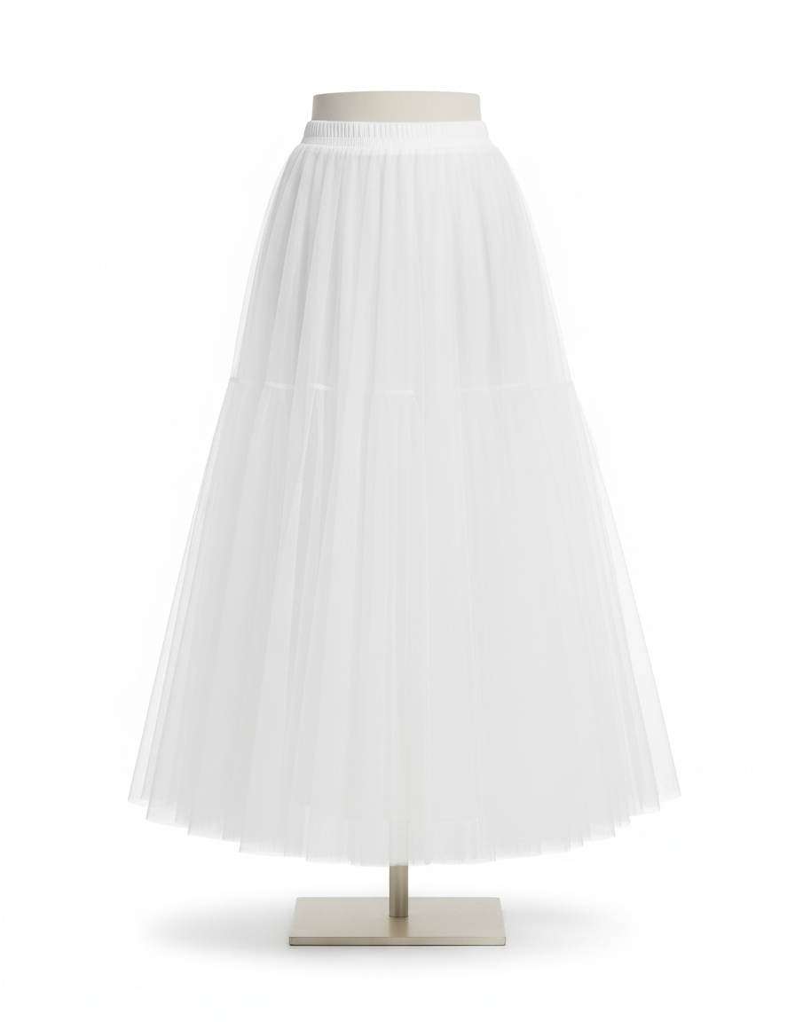 Cette jupe est un vêtement long de couleur blanche, confectionnée à partir de plusieurs couches de tulle. Elle présente une coupe ample et fluide, tombant jusqu'aux chevilles.