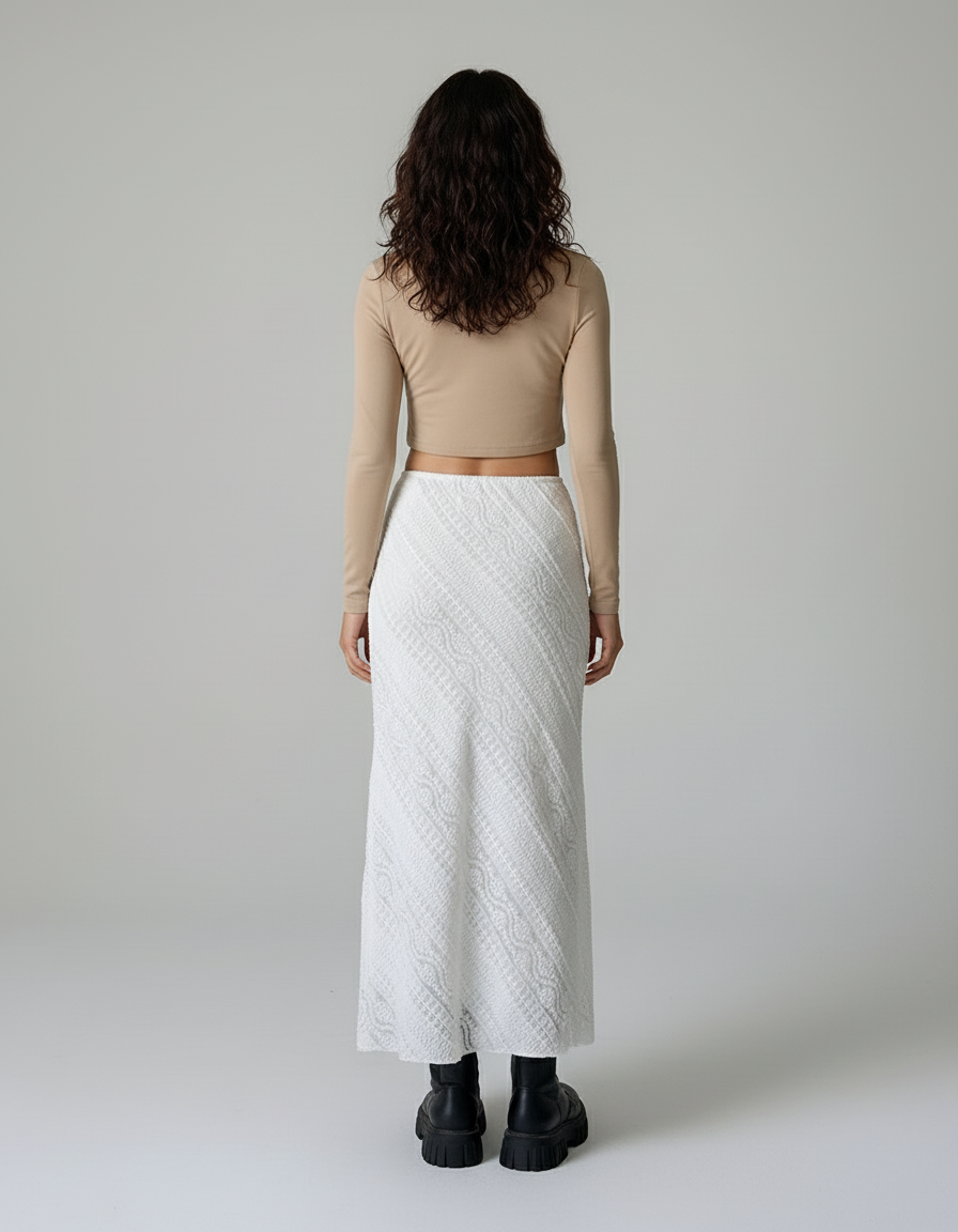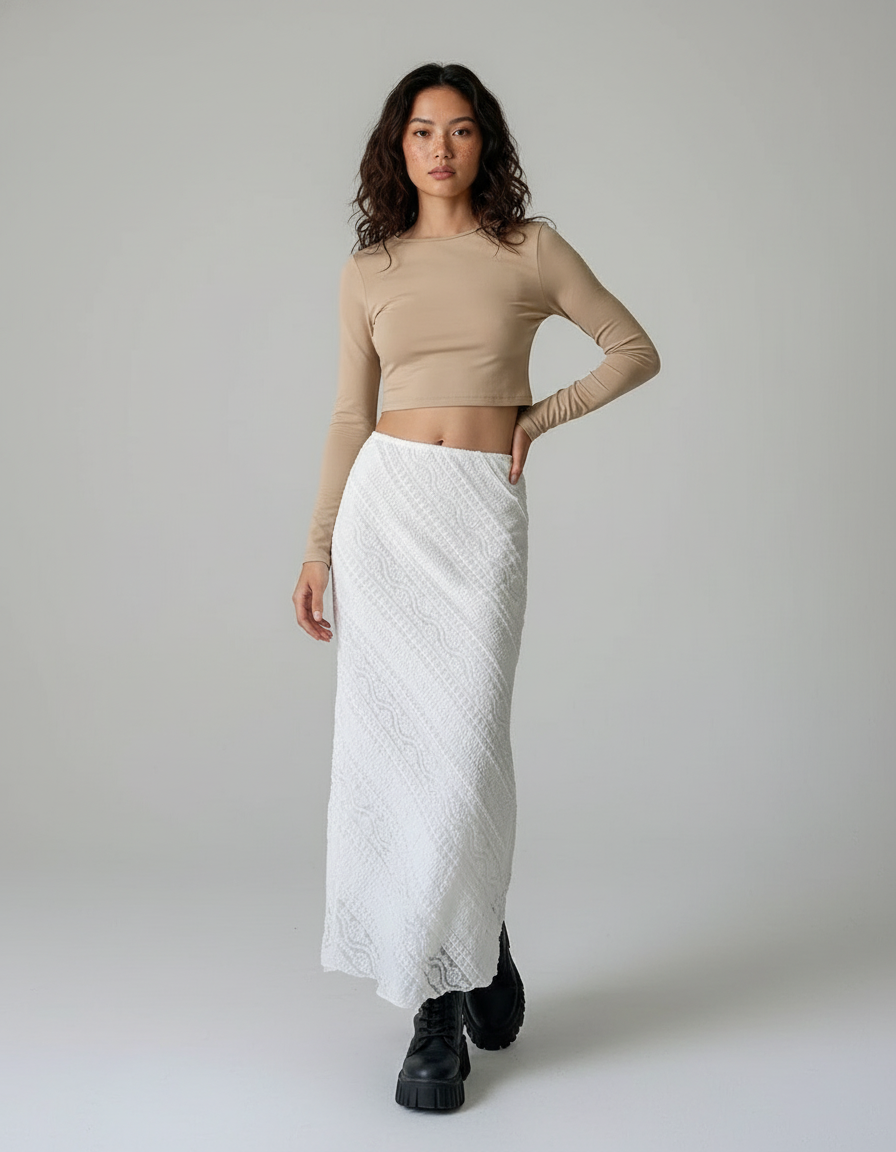 Ajoutez une touche de sophistication décontractée à votre garde-robe avec notre jupe longue en dentelle blanche.