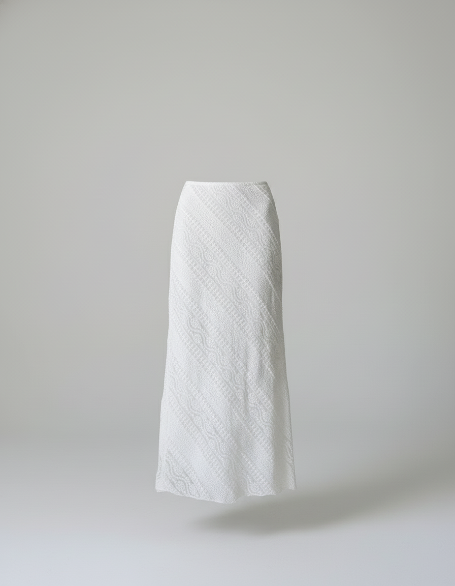 Cette jupe est de couleur blanche et présente une coupe longue. Elle est confectionnée dans un tissu à motifs texturés sur toute sa surface.