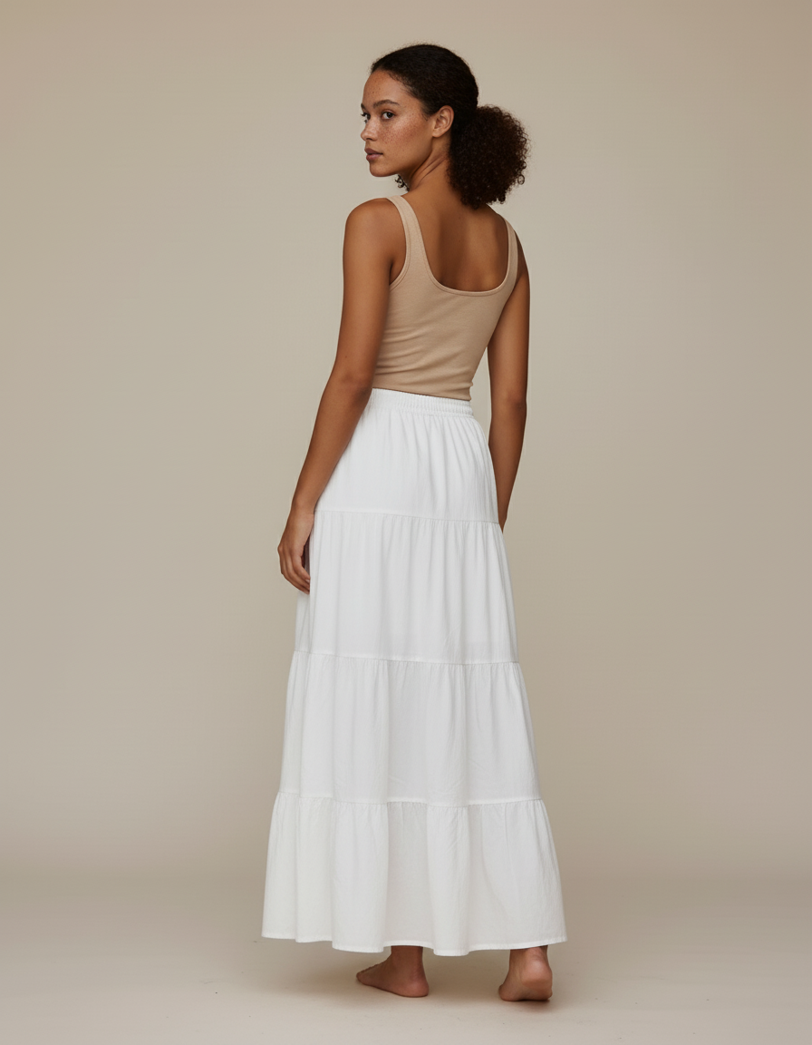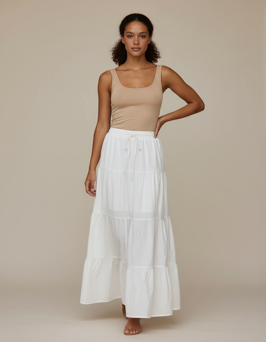 Cette jupe est une pièce longue et blanche, présentant une confection à plusieurs niveaux (tiered). Elle est dotée d'un cordon de serrage visible à la taille.