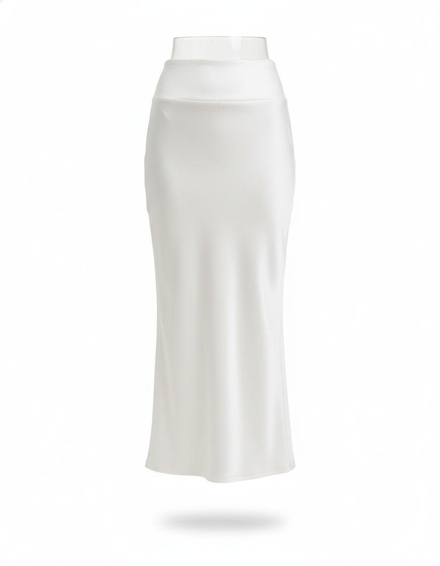 Cette jupe longue en satin blanc incarne l'élégance et la polyvalence pour toutes vos occasions.