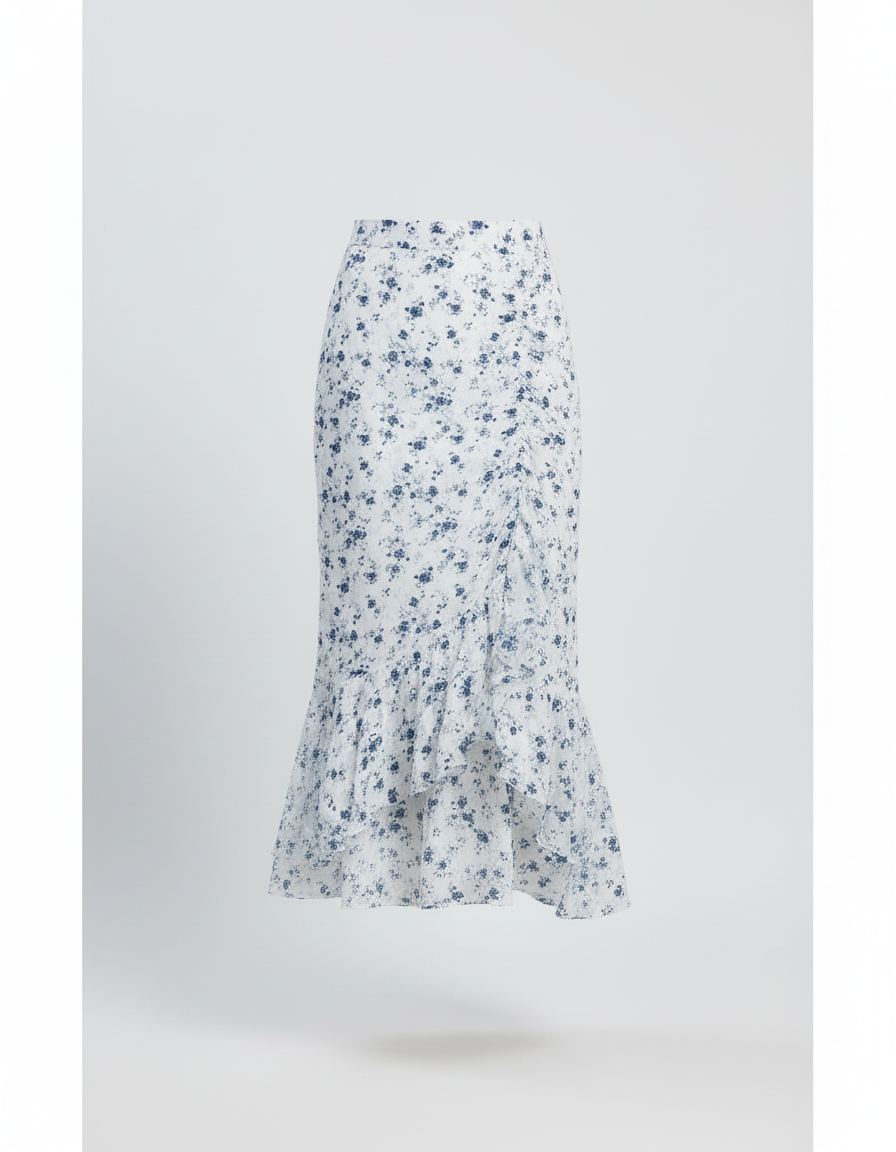 Cette jupe présente un motif floral bleu sur un fond blanc. Elle est de coupe longue avec un ourlet à volants et une taille élastique.