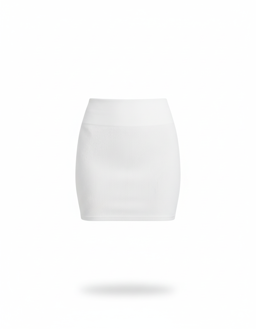 Cette jupe courte blanche présente une texture côtelée. Elle est ajustée et arrive au-dessus du genou.