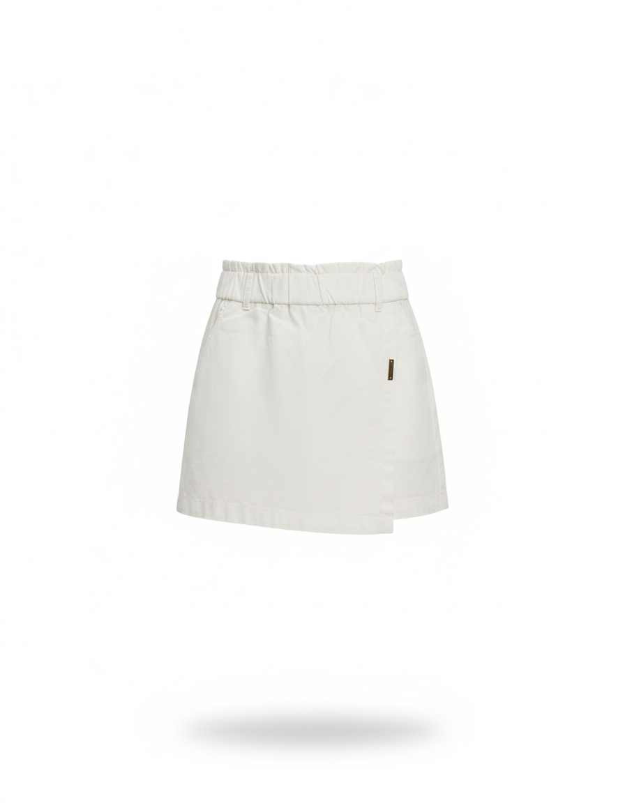 Cette jupe courte blanche présente une taille élastique et une coupe avec un ourlet asymétrique. Elle est disponible en plusieurs tailles et offre un style décontracté.
