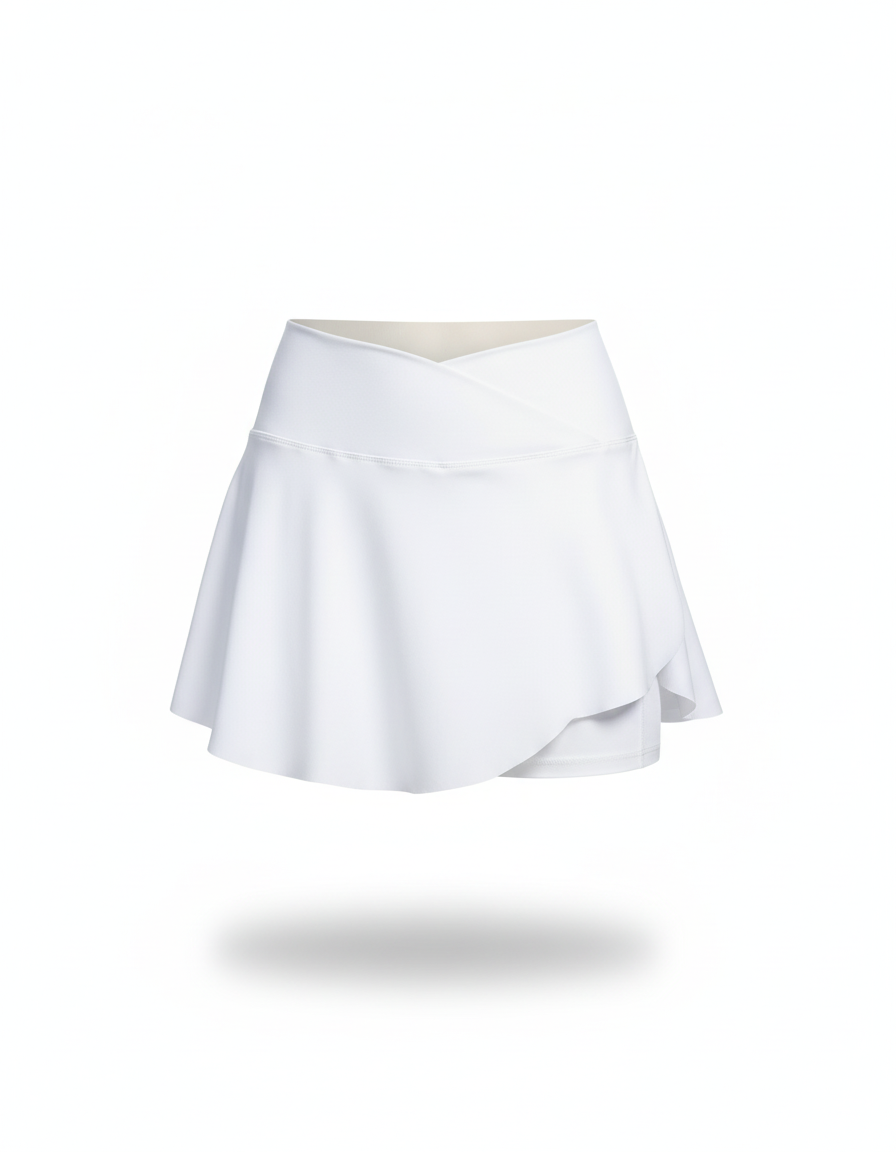 Une jupe courte de couleur blanche avec un short intégré, conçue pour l'activité physique ou les loisirs. Elle présente une coupe évasée et une taille haute.